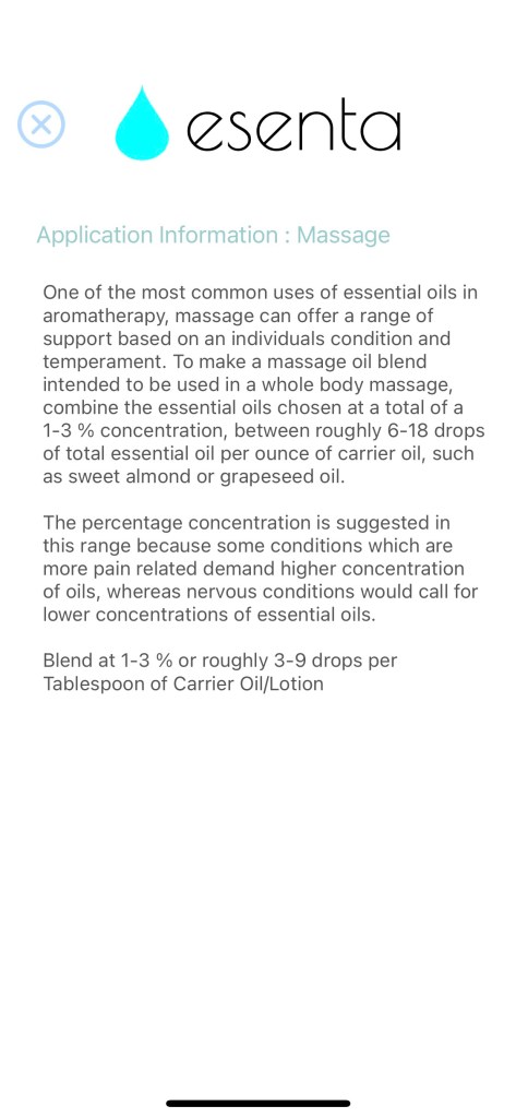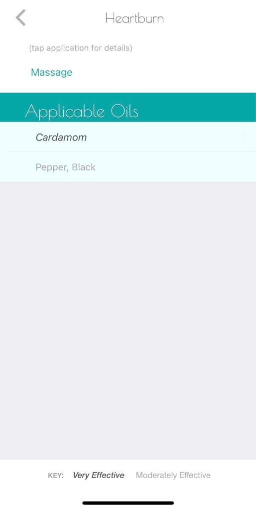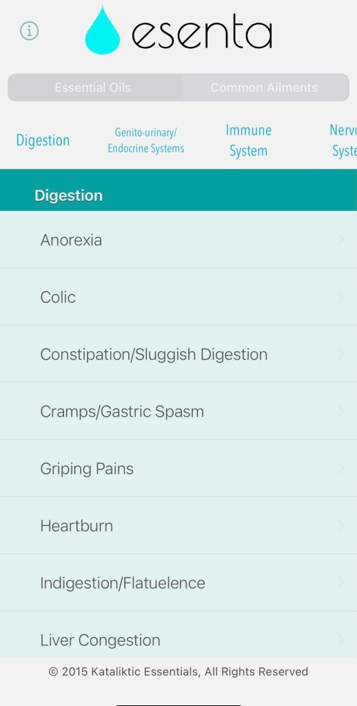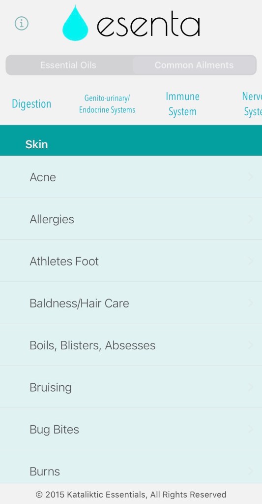 In addition, the Esenta App lends information on oils that can be used when experiencing specific conditions. This area of the App is organized by the systems of the body in a scrolling menu tab reveals various conditions within that body system. Each condition within that body system is listed alphabetically and is clickable, which opens up to a list of applicable essential oils and an additional tab at the top that lists the method for use. This tab also expands to detailed instructions for dilution and application for that specific method of use.