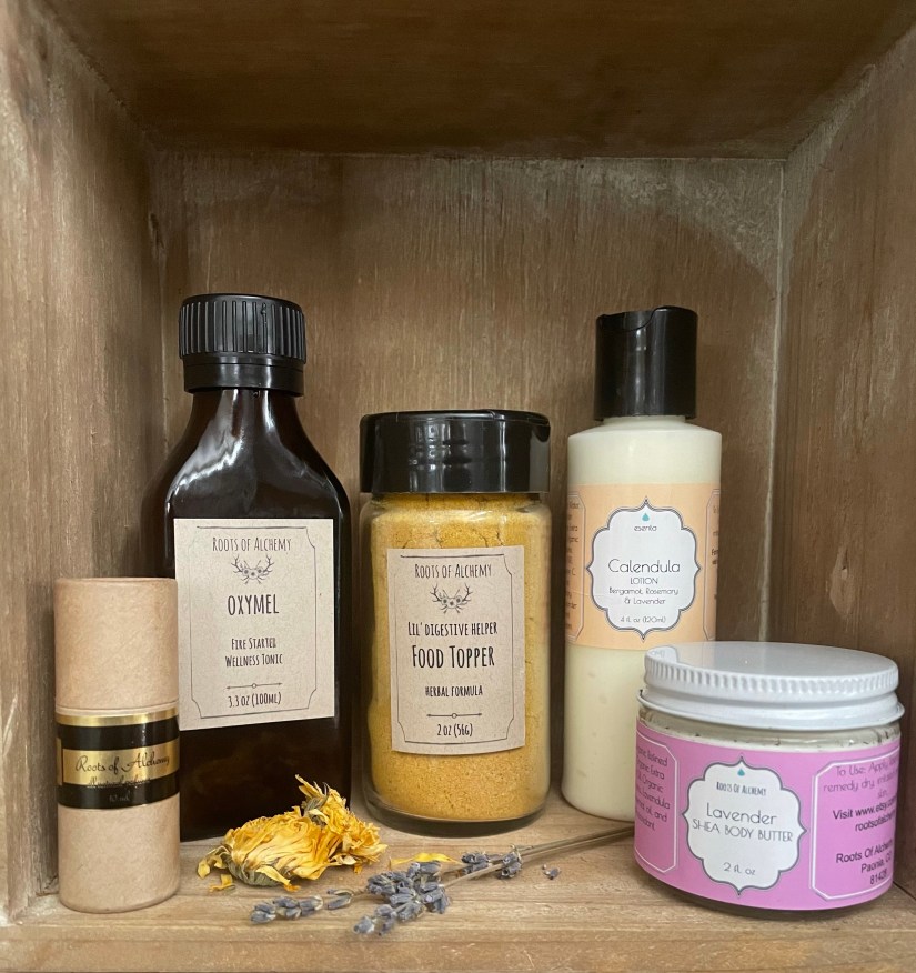 Roots of Alchemy’s natural body care and offerings include lotions, body butter, oil-based facial cleansers, facial serums, hydrosols, salves, lip balms, body oils, natural perfumes and other all natural skincare products, digestive superfoods, fire cider, and other wellness therapeutics using herbal botanicals created in house and locally in Colorado.